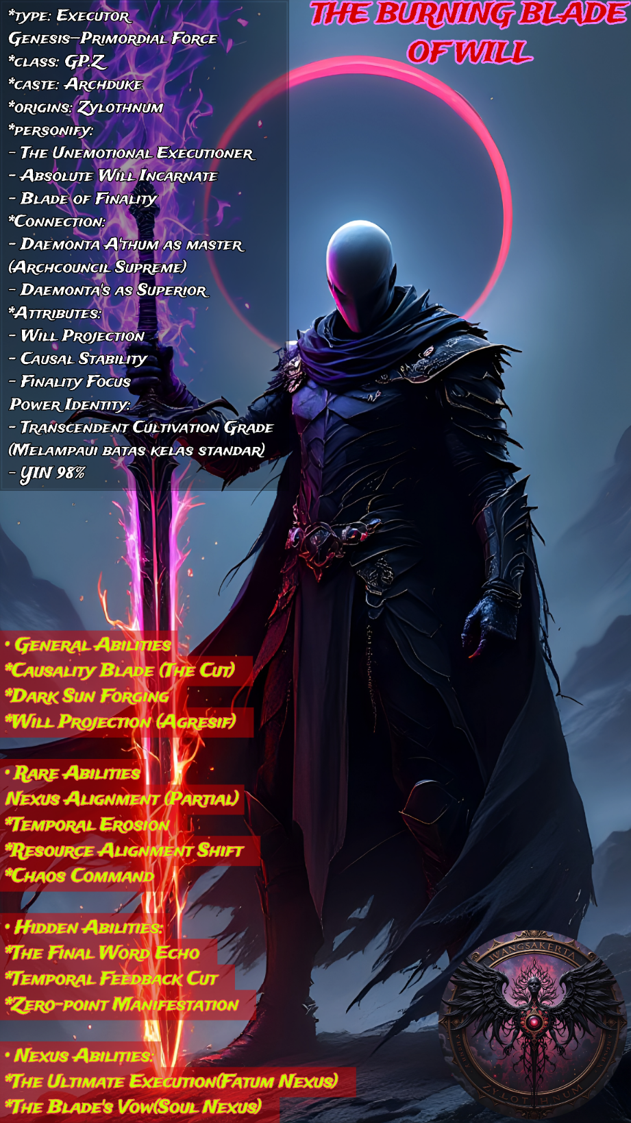 *Dark Sun Forging: Mampu menyalurkan energi dari Black Sun (inti Zylothnum) untuk “menempa” realitas baru yang sesuai kehendak.